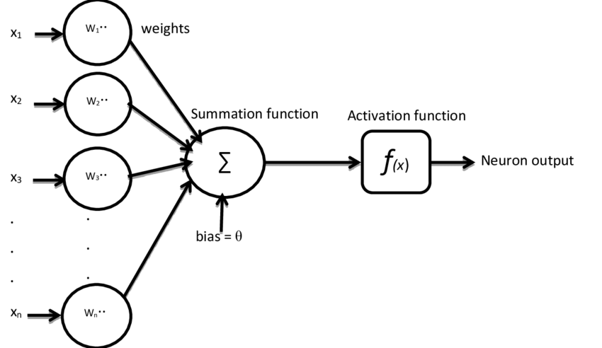 Legyenek a bemenetek rendre x1, x2…xn, a hozzájuk tartozó súlyok w1, w2…wn, az eltolás pedig b. A neuron által elvégzett művelet a következő: